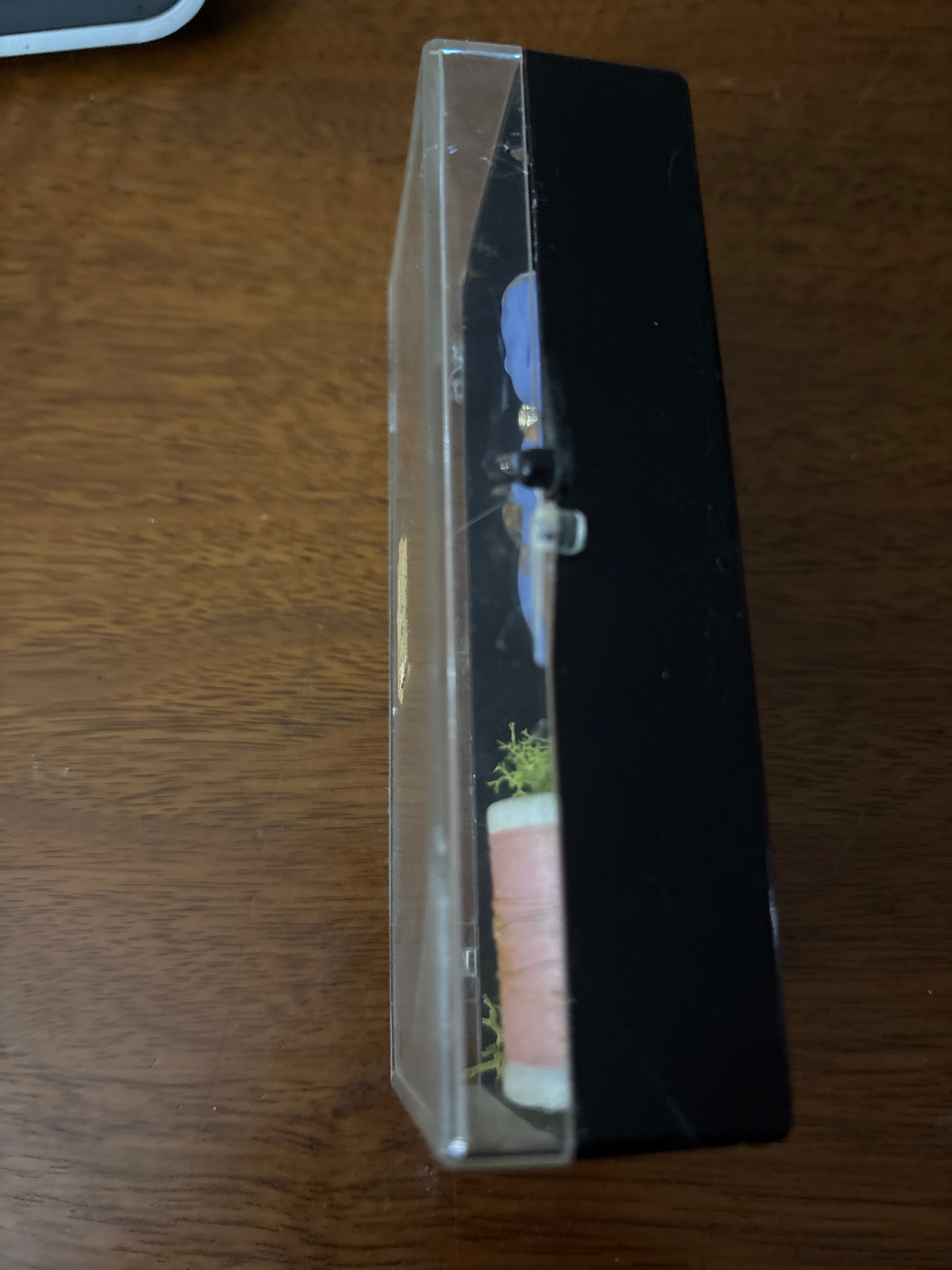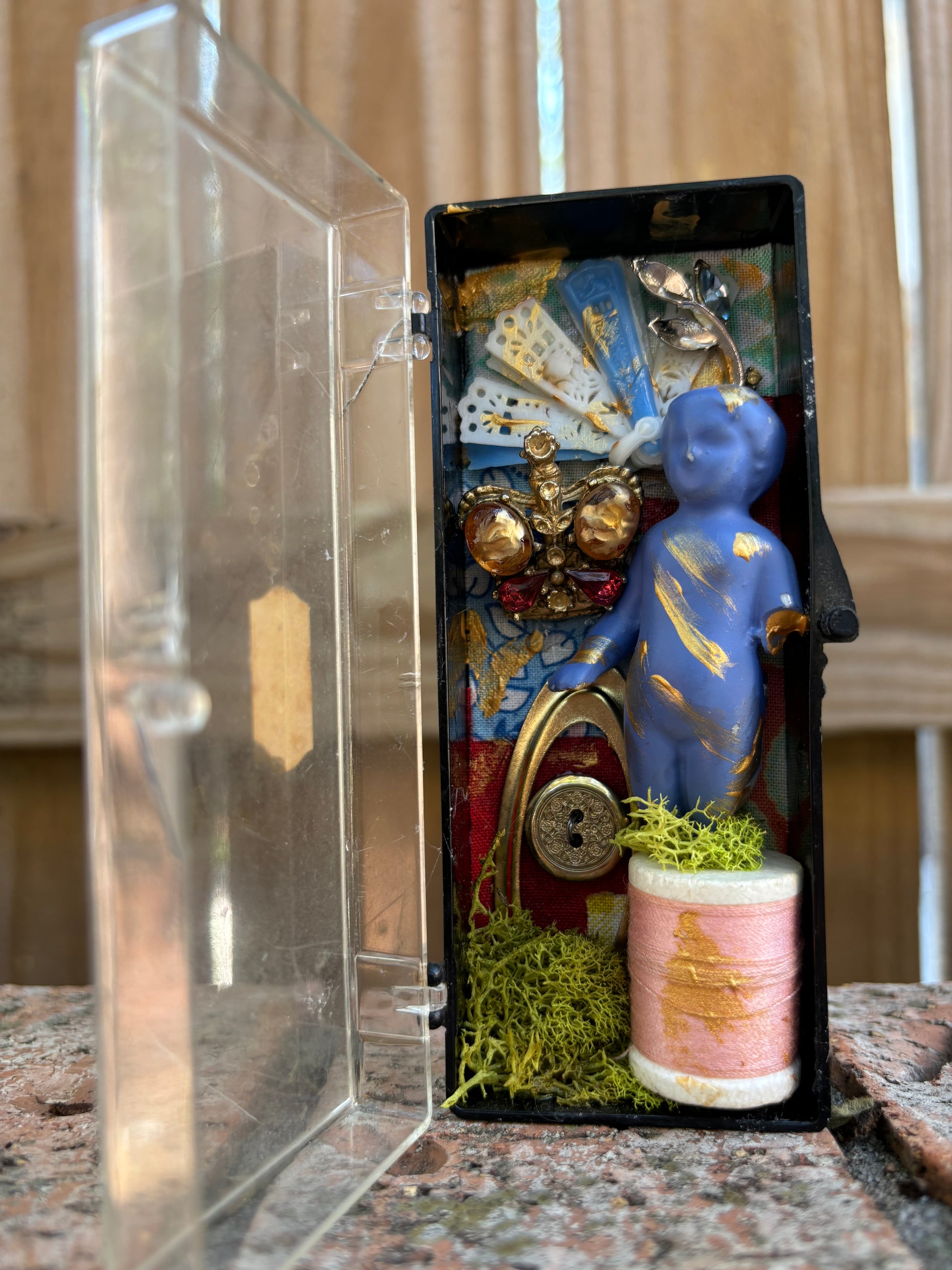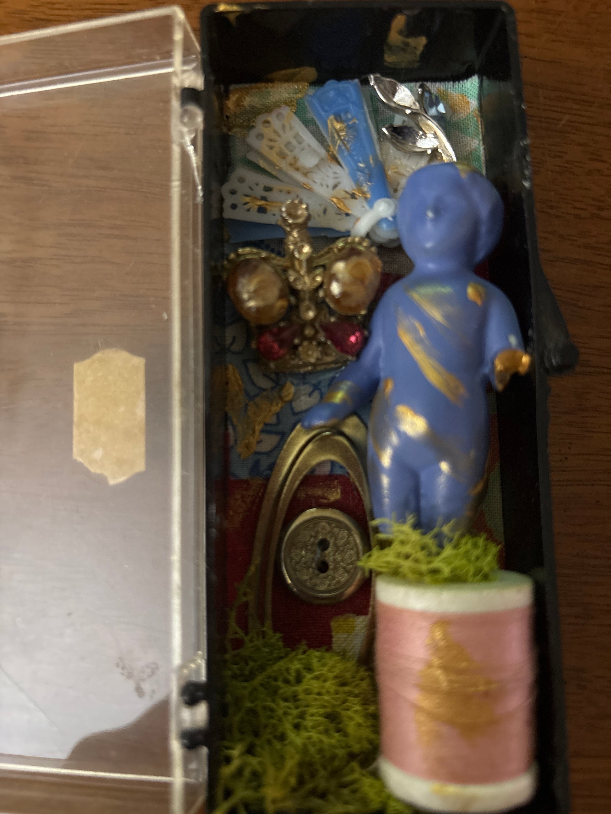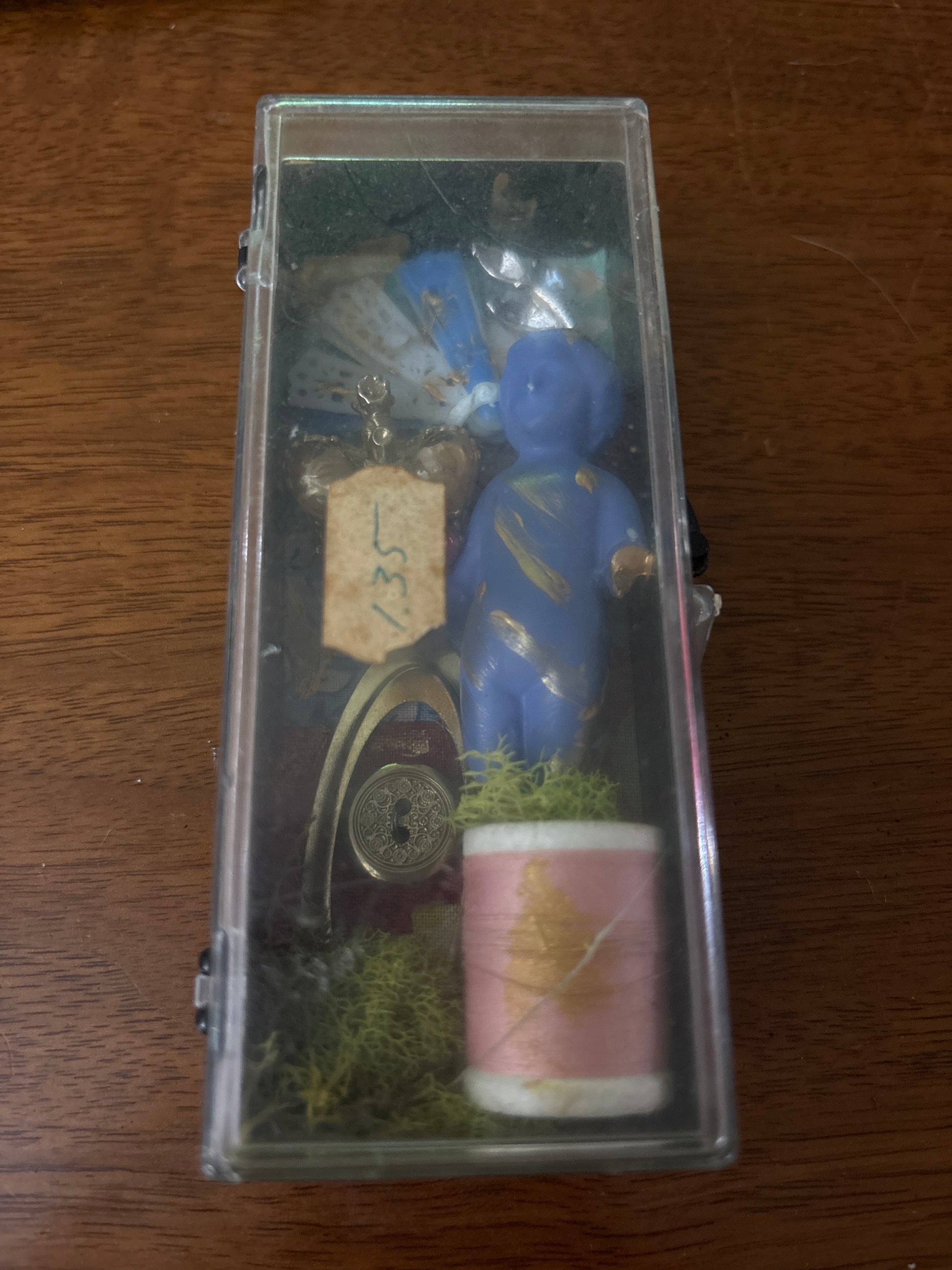 Imperfect vintage items rescued and curated into this unique piece. Tucked inside a plastic vintage bait container.