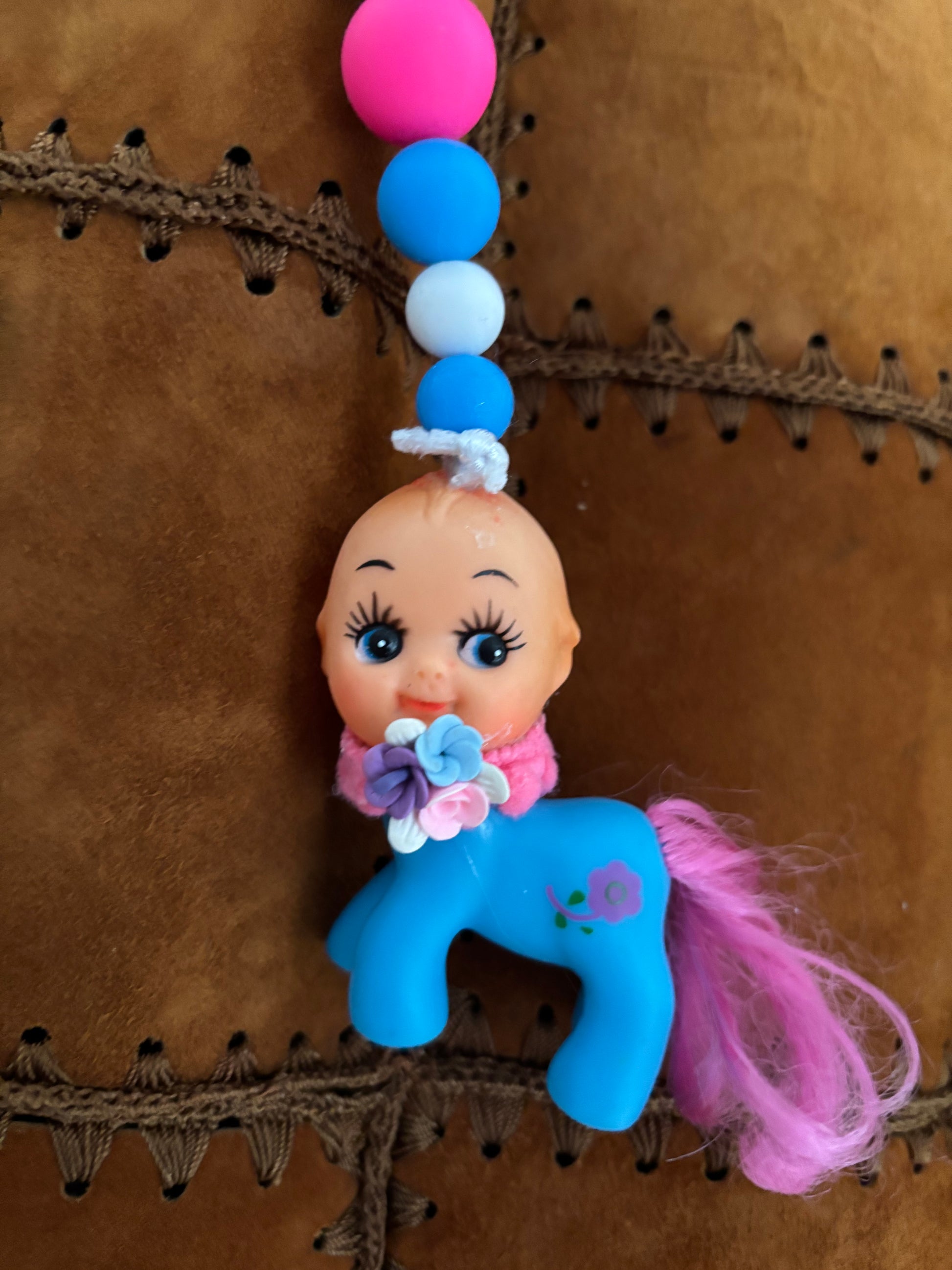 Adorable upcycled vintage kewpie head attached to pony body. Attached to a keyring and lobster clasp.