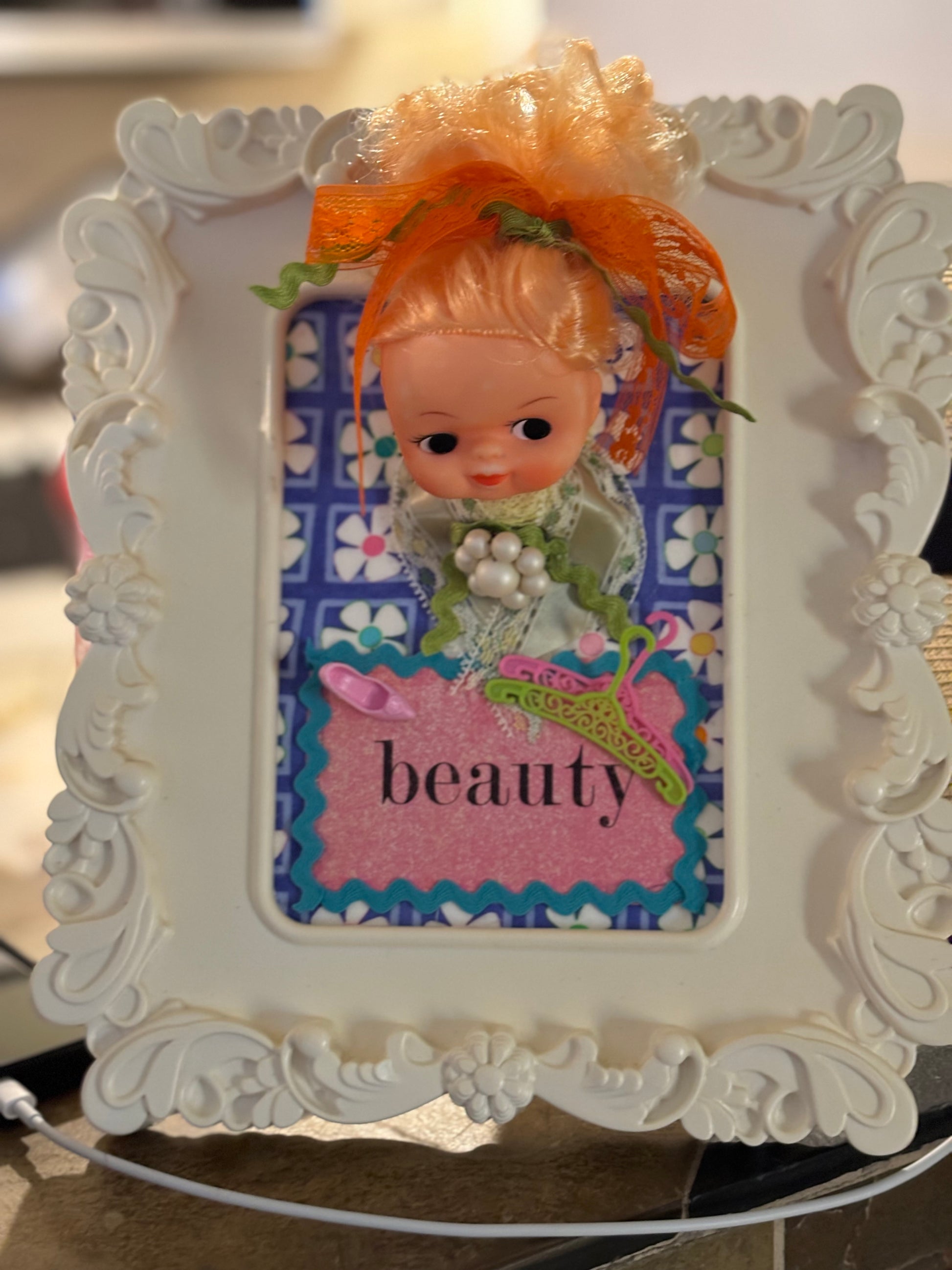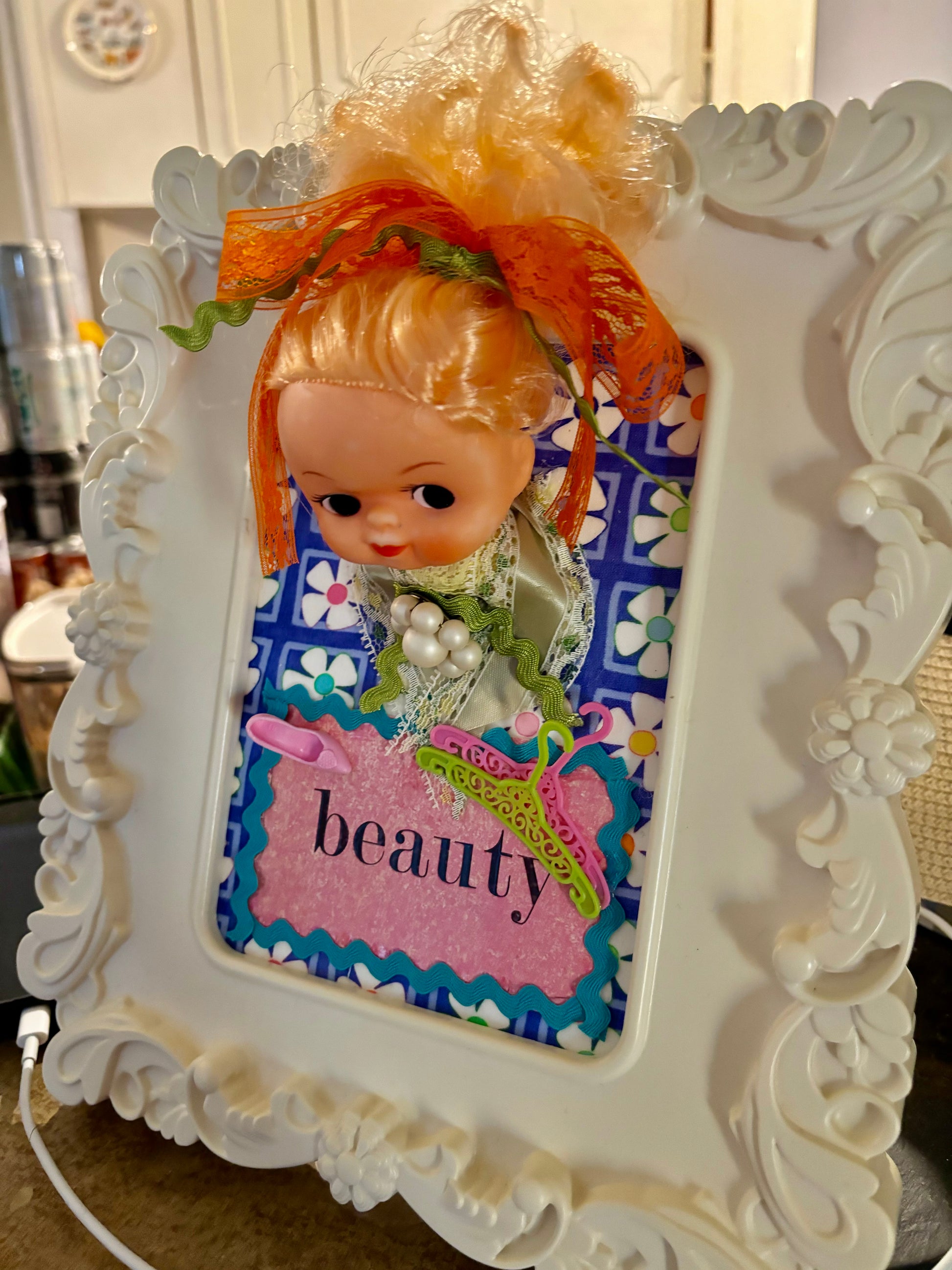 Enjoy this cutie created using a vintage doll head, ephemera, and other found treasures.