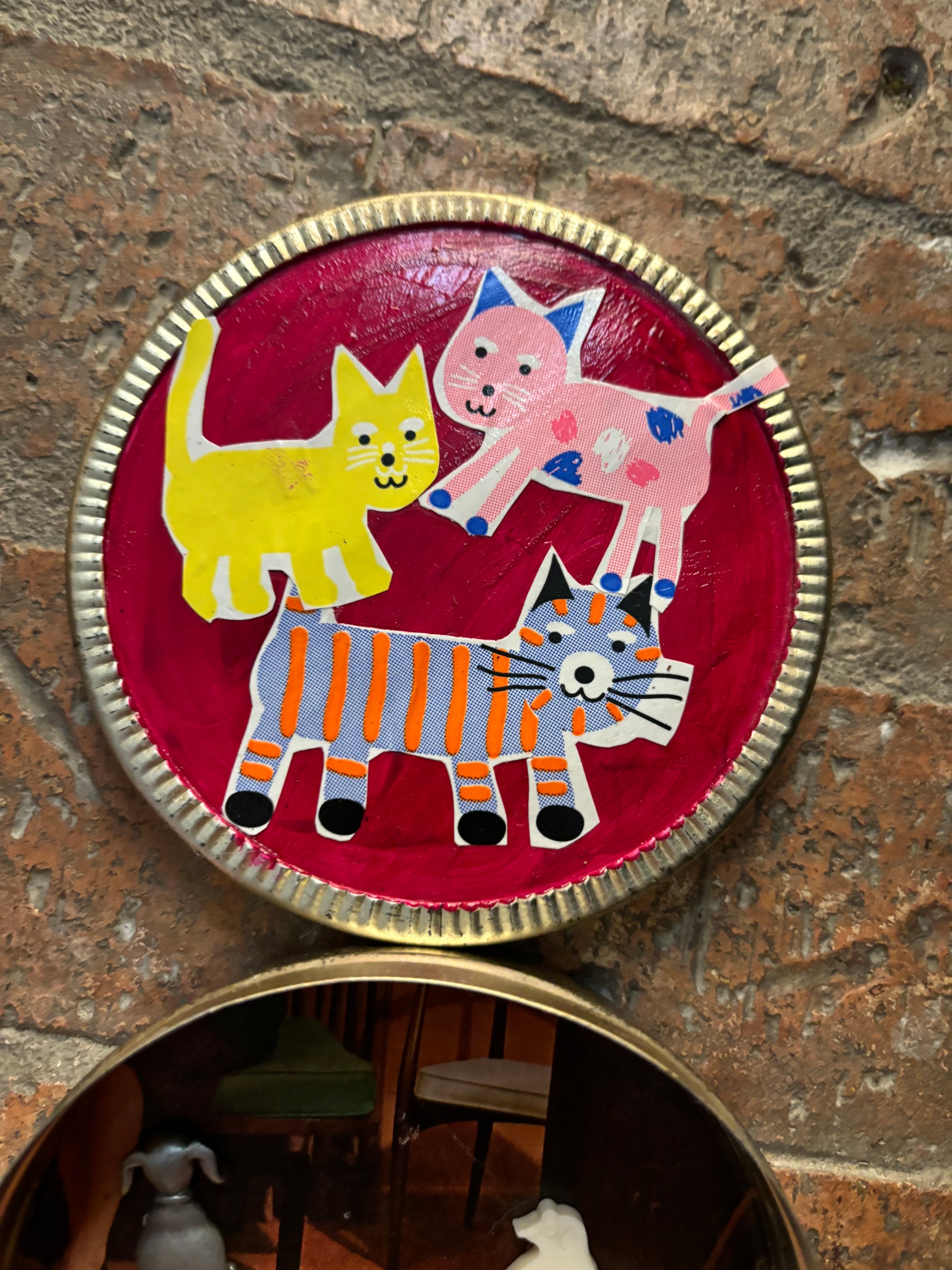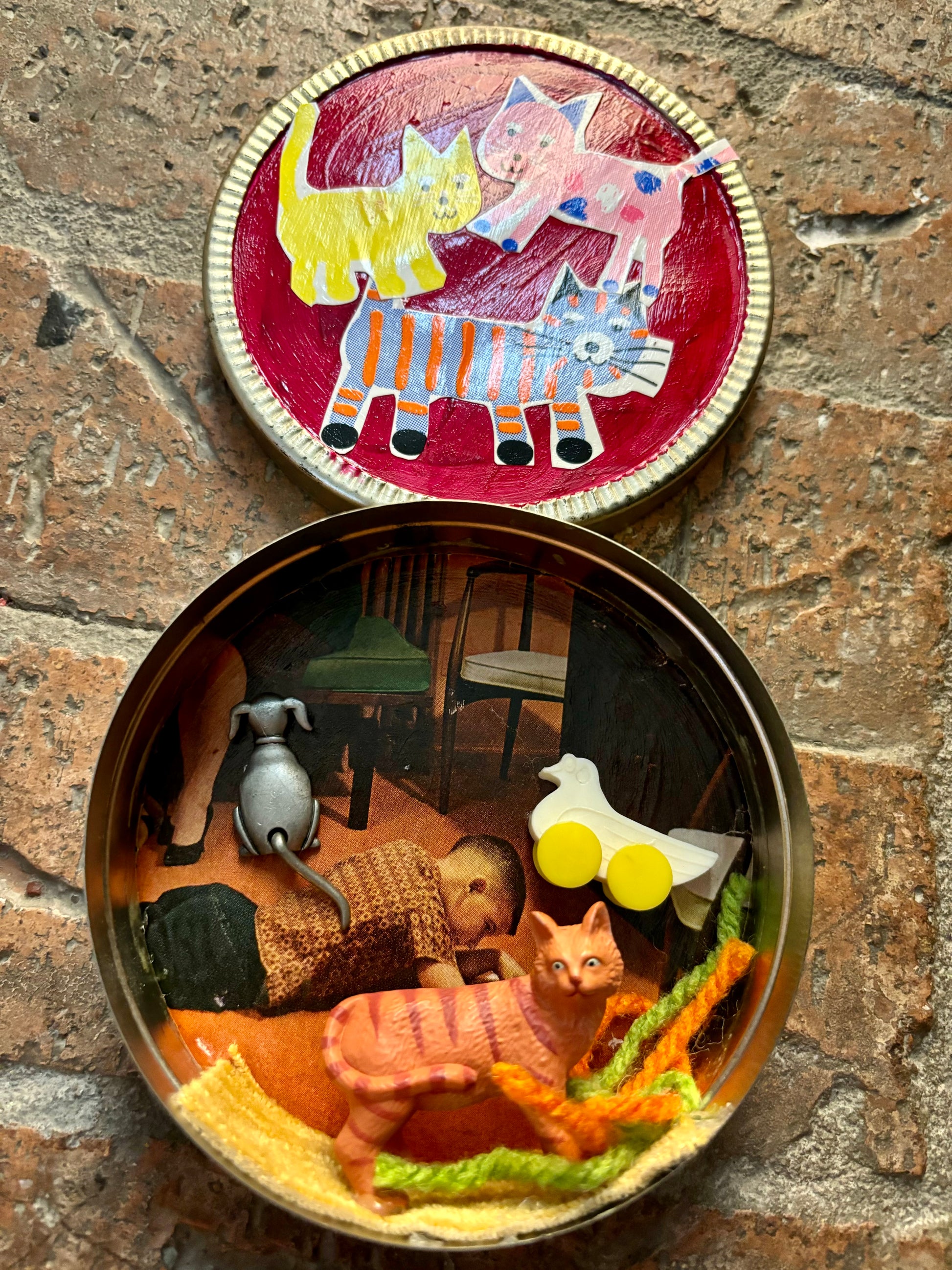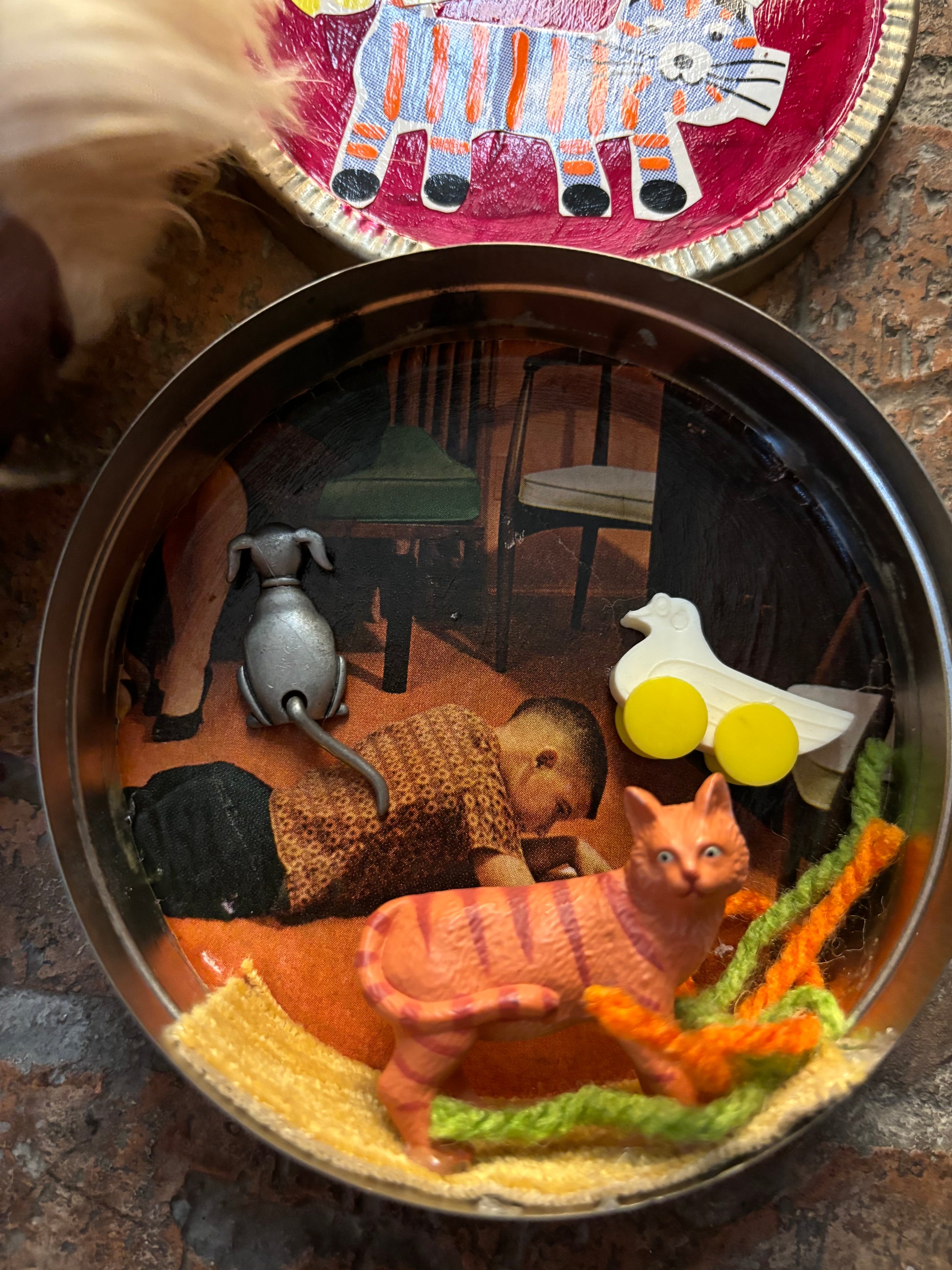 Just a typical night at home-with a vintage metal dog brooch, magazine photo, and plastic toys. A vintage canister displays this adorable scene.